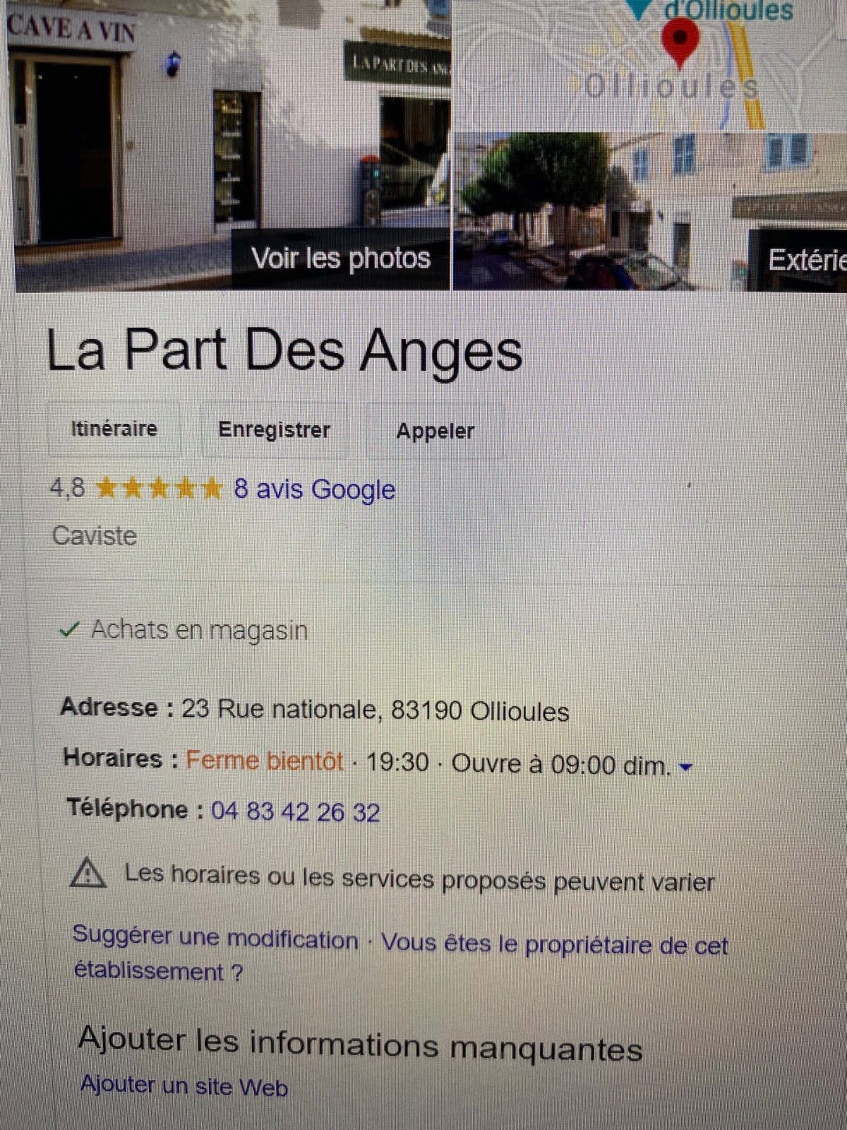 Toute l’équipe de la part des anges vous accueille du mardi au samedi de neuf heures à midi et de 16 heures à 19h et les dimanches et jours fériés de 9h30 à 12h30. Nous saurons vous conseiller au mieux que ce soit pour nos vins en bouteille ou en bib, nos alcools et spiritueux ou encore tous nos accessoires ainsi que pour des idées cadeaux variées et originales ou encore de l’huile d’olive issue des producteurs locaux.