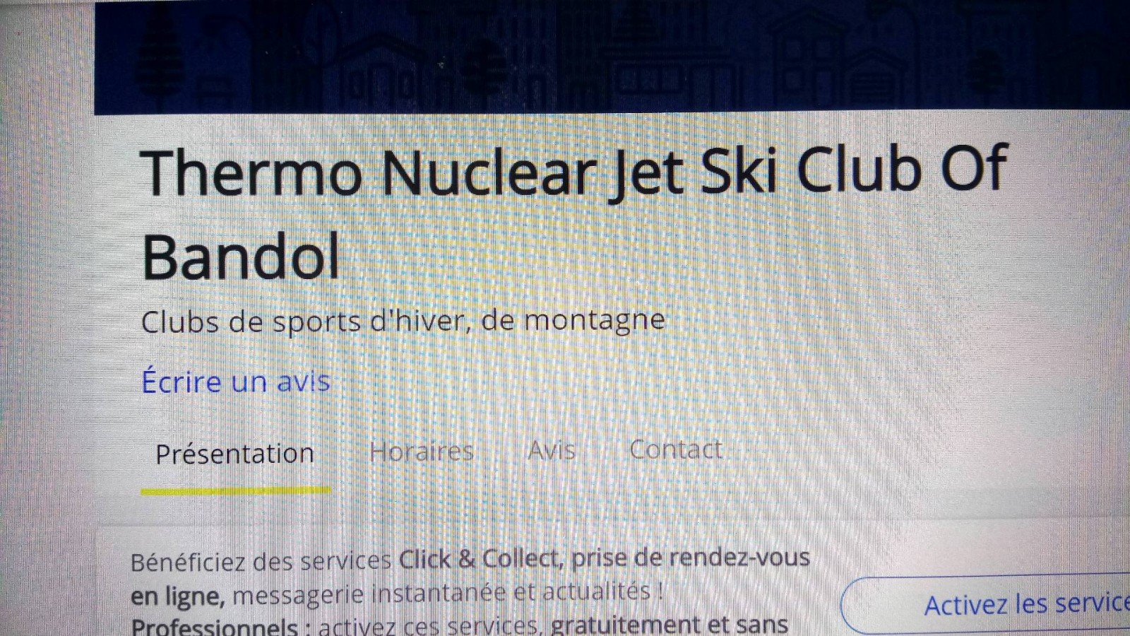 Vous pouvez contacter la société thermo nuclear Jet ski club of Bandol situé au 2 boulevard Victor Hugo 83150 Bandol vous pouvez les contacter par téléphone