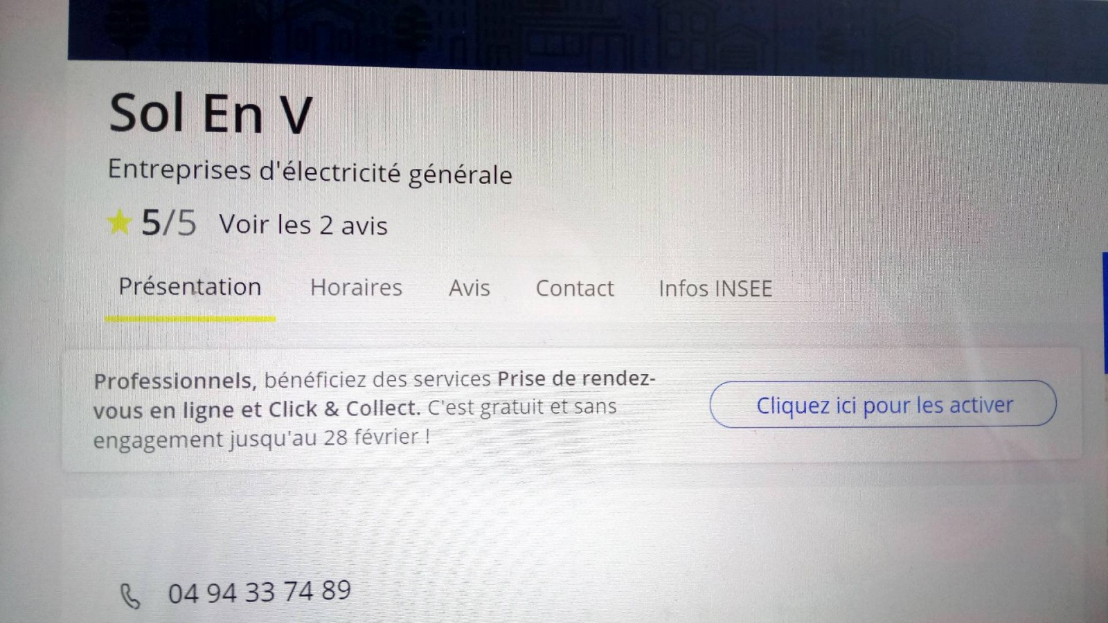 contacter la société sol en v qui est une entreprise d'électricité générale qui est situé au chemin mal vallon 83210 Solliès-Toucas vous pouvez les joindre par téléphone 04 94 33 74 89
