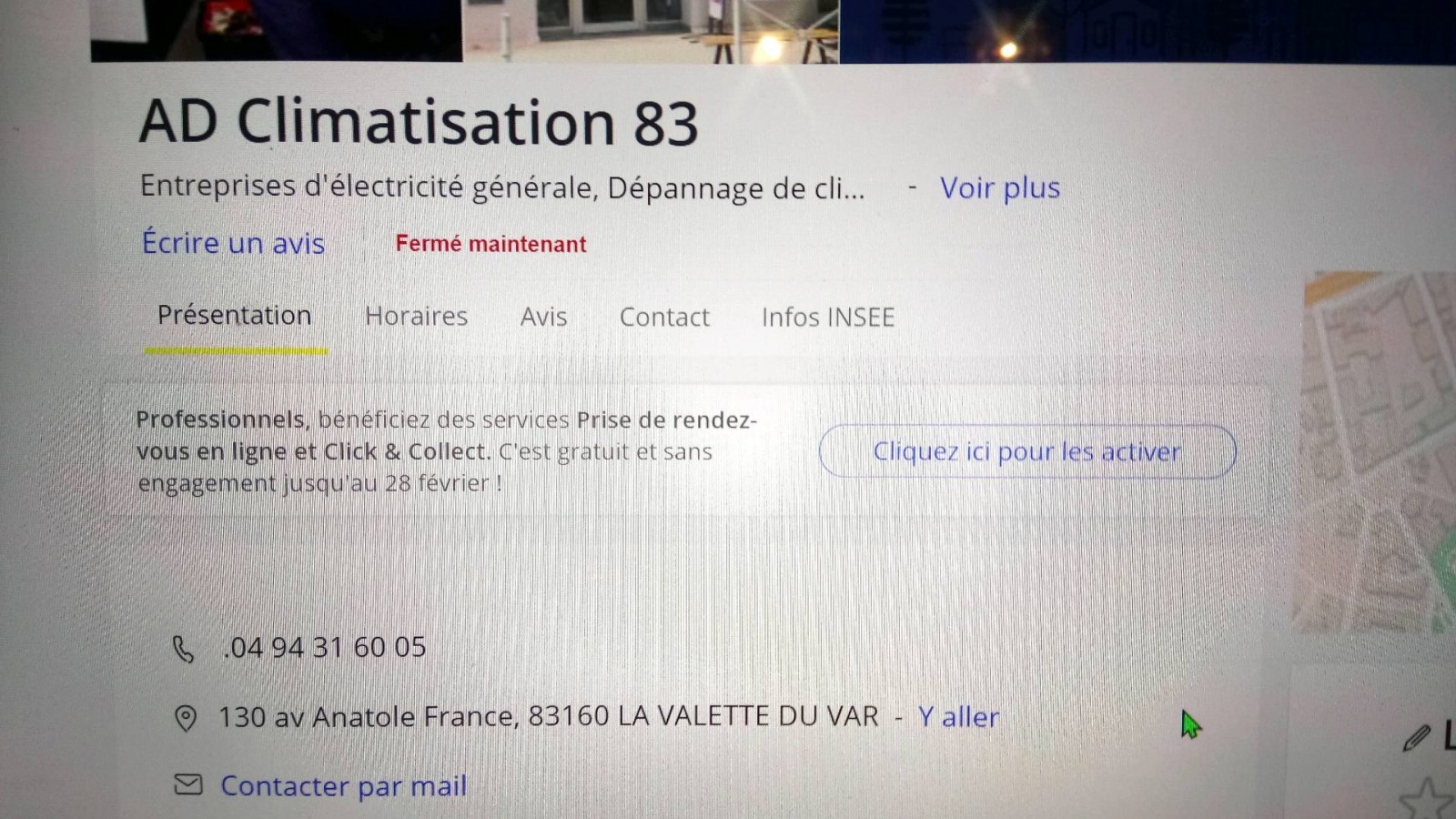 vous pouvez joindre la société ad climatisation 83 qui est une entreprise d'électricité générale et de climatisation vous ils sont situés au 130 avenue Anatole-France 83160 la Valette-du-Var vous pouvez les contacter par téléphone au 04 94 31 60 05