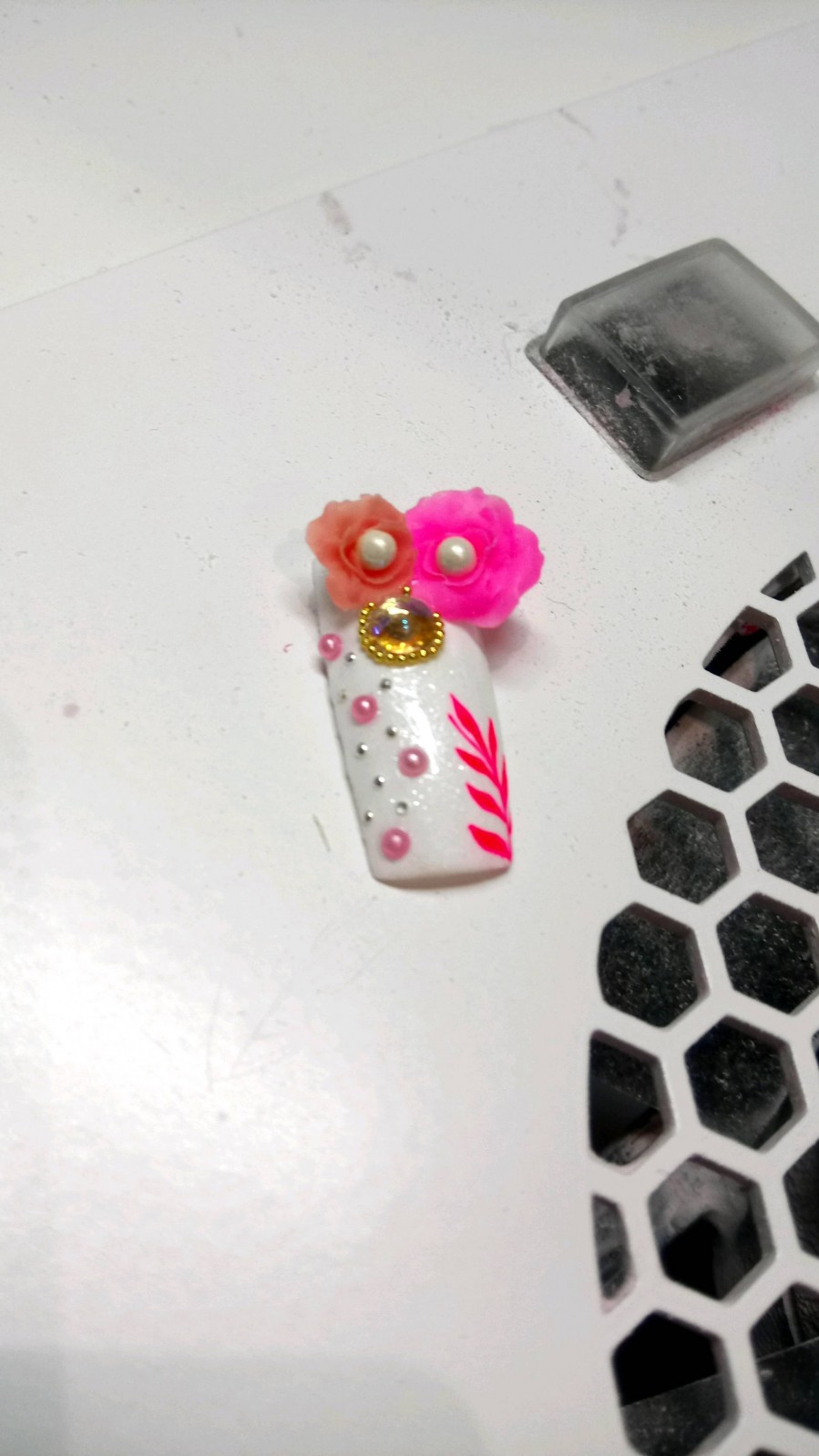 voici donc plusieurs photos de ce que j'ai pu faire avec elle en position non des petites perles rose argenté et blanche et un dessin rose pour aller avec sa future robe de mariée