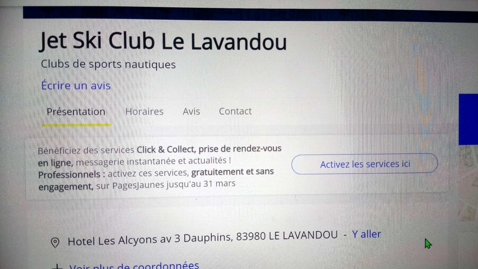 vous pouvez contacter le jet ski club le lavandou qui est un club de sport nautique à situé à l'Hôtel les alcyons avenue 3 dauphins 83980 le lavandou